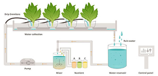 In this system, a pump delivers nutrient solution through pipes and drippers directly to the root zone of each plant. This method can be closed (circulating) or open (with effluent) and is widely used for growing vegetables, fruits, and ornamental plants.