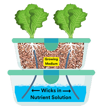 In this passive system, the nutrient solution is transferred from the tank to the plant roots using a wick (cotton or nylon rope). This method is simple and does not require a pump or timer, and is suitable for small plants or those with low nutrient requirements.