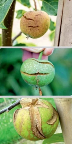 Boron deficiency in apples causes a wide range of symptoms, primarily affecting fruit quality and tree growth. Fruits typically develop small, watery, corky or brown lesions in the flesh that may dry out and develop spongy areas. The fruits can be small, misshapen and cracked, often with rough and heavily rusted skin. Severe deficiencies result in poor flower formation and “bloom blast”, in which the flowers shrivel and die. Boron deficiency on the tree also causes terminal bud death, shortened internodes, brittle and thickened leaves. This deficiency can affect the movement of calcium in the tree, reducing fruit size, causing premature fruit drop and increasing apple bitterness. Boron deficiency symptoms often resemble those of calcium deficiency but appear earlier in the fruit’s development.