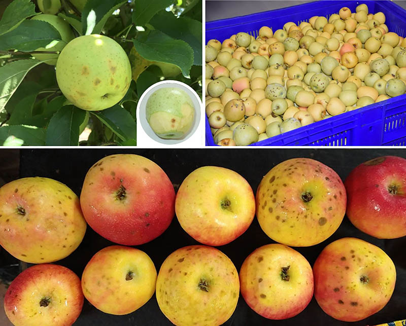 Calcium deficiency in apples primarily causes a physiological disorder called (bitter spot) that appears as small, dark, sunken, and sunken spots on the skin of the apple, often concentrated near the bottom of the fruit bowl. These spots correspond to small, brown, corky areas within the flesh of the apple. Symptoms of bitter fruit usually appear a few weeks before harvest or during storage. This disorder is caused by a localized deficiency of calcium in the fruit, which leads to the breakdown of cell membranes and cell walls, compromising the firmness and quality of the fruit. Symptoms of calcium deficiency do not usually appear on the leaves, but develop on the fruit as it matures. Factors that exacerbate calcium deficiency include acidic, sandy, or light soils that leach calcium, drought stress, high levels of nitrogen or potassium in the fruit or soil that interfere with calcium uptake.