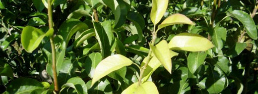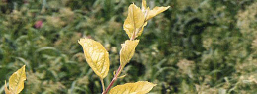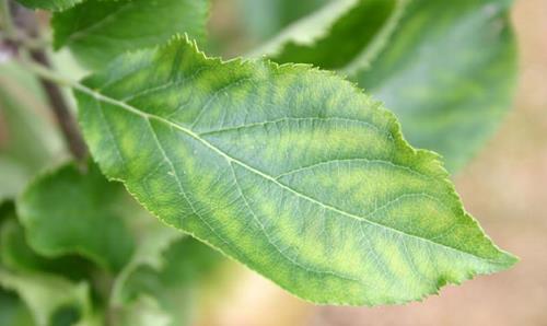 Iron deficiency in apples is most evident as interveinal chlorosis (yellowing), in which the youngest leaves turn yellow between the veins while the main veins remain green. As the deficiency progresses, the entire leaf can turn a pale yellow, and in severe cases, necrotic spots or burns appear along the leaf margins. This condition is more common in apples grown in alkaline soils or poorly aerated conditions, as high pH makes iron unavailable to the roots, regardless of its abundance in the soil. Iron deficiency impairs chlorophyll production, reduces photosynthesis, and overall tree vigor.