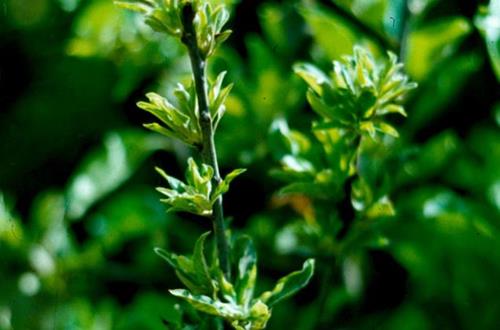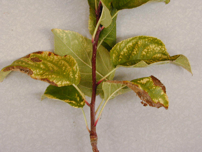 Zinc deficiency in apples manifests itself primarily in spring as symptoms of “small leaf”: young leaves are short, abnormally narrow, and clustered at the tips of branches, often accompanied by interveinal chlorosis and brown spots of dead tissue. Branches grow slowly, internodes are shortened, and branches may show sparse foliage and dieback. Severely affected trees may produce small, misshapen fruit and poor fruit color. This disorder is more common in alkaline soils and soils rich in iron or phosphorus, as these conditions limit zinc availability.