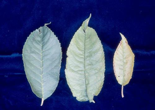 Sulfur deficiency in apples typically results in reduced leaf growth, leaves turning pale green or yellow, and sometimes yellow spots develop near the leaf margins. Symptoms usually begin on younger leaves and can be confused with nitrogen deficiency, which instead affects older leaves. Poor growth and uniform yellowing of leaves are common symptoms. Adequate sulfur is important for healthy new growth, optimal fruit number and size, and overall yield. Treatments include the use of sulfur-containing fertilizers and soil amendments to restore nutrient levels.