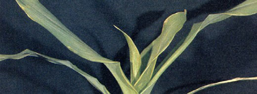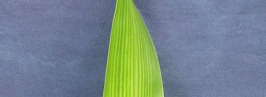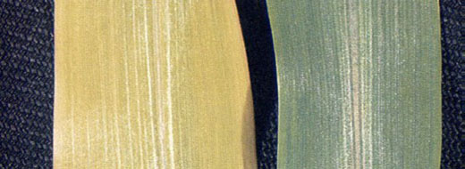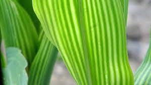 Copper deficiency in corn shows yellow streaks (between the veins) on young leaves, mainly at the base of the leaf. The edges of the leaves turn yellow, leading to necrosis (browning/death) and in severe cases potentially the loss of entire leaves.