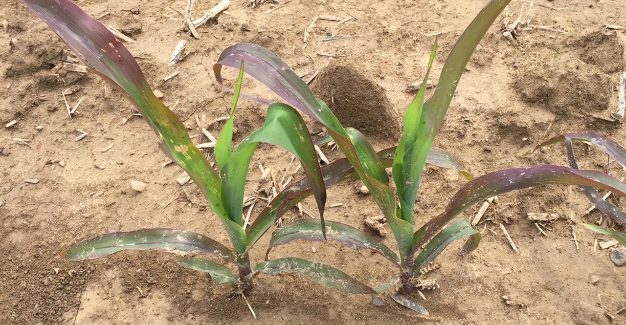Phosphorus deficiency mainly affects young corn plants. Purple-red colors appear on the leaf margins, veins, and stems, often extending across the entire leaf blade. The dark green foliage contrasts with the purple discoloration, especially in young plants.