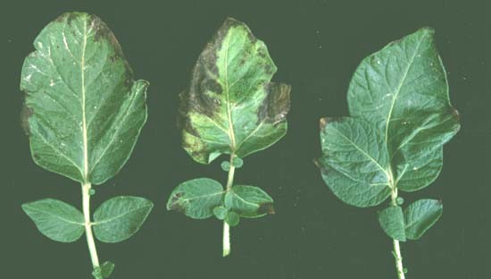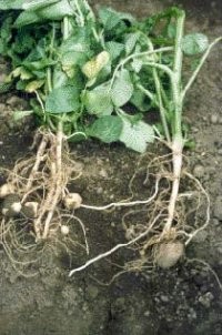 Phosphorus deficiency in potatoes causes stunted growth, thin, vertical shoots, and darker leaves than normal with cup-shaped margins upward and sometimes a purple discoloration, especially on the underside of the leaf or stems; severe deficiency results in poor root development, reduced tuber number and size, and the development of rusty brown spots or streaks inside the tubers, the initial symptoms of which are sometimes difficult to detect but ultimately, if not corrected, are reflected in delayed maturity, reduced yield, and reduced tuber quality.