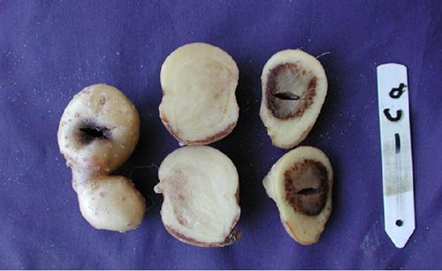 Calcium deficiency in potatoes primarily causes physiological disorders such as internal browning (also called internal rust) and hollowing of tubers, which reduce tuber quality and marketability. Symptoms on the plant include necrosis and browning of the margins and tips of young leaves, twisting and deforming of young leaflets, and death of young shoot tips, flower stalks, and growing points due to calcium immobilization and its role in cell wall strength. Root growth is also impaired, resulting in browning of roots and poor nutrient uptake. Symptoms of calcium deficiency are often subtle in potato leaves because most soils have sufficient calcium for vegetative growth, but localized deficiencies in developing tubers can lead to postharvest quality losses such as bruising and rot. Calcium deficiency management involves balanced fertilization and, in some cases, foliar application or application of calcium to the soil during tuber growth to ensure adequate calcium supply to the growing tubers.