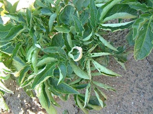 Copper deficiency in potatoes is usually not very pronounced, but when it occurs, symptoms include wilting and curling of young leaves inwards, drying or dying of the tips and margins of leaves without obvious chlorosis. New leaves may be smaller and misshapen with curled margins, and stems often appear thin. Copper deficiency can also cause darkening of the veins in young leaves and necrotic spots on the leaves, sometimes progressing to necrosis of the tuber tip, which affects tuber quality. Root death and reduced tuber production can result from severe deficiency. This deficiency usually occurs in high pH or organic soils where copper availability is limited. Copper plays an important role in photosynthesis, enzyme activation and lignin formation, so its deficiency reduces plant vigor and increases susceptibility to disease.