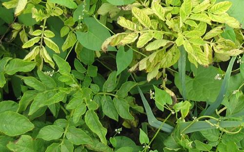 Iron deficiency in potatoes is characterized by interveinal chlorosis, which primarily affects the youngest leaves, where the leaf blades turn pale yellow or white while the veins remain distinctly green. This chlorosis results from impaired chlorophyll formation due to a lack of iron, an essential micronutrient for photosynthesis and energy production. In cases of severe deficiency, young leaves may turn almost completely white and growing points can die. Stunted growth and reduced plant vigor are common, especially in calcareous or high pH soils where iron availability is limited. Iron deficiency symptoms are more noticeable in bright sunlight and can be confused with other nutrient deficiencies, but are recognizable by the chlorosis pattern on young leaves and green veins.