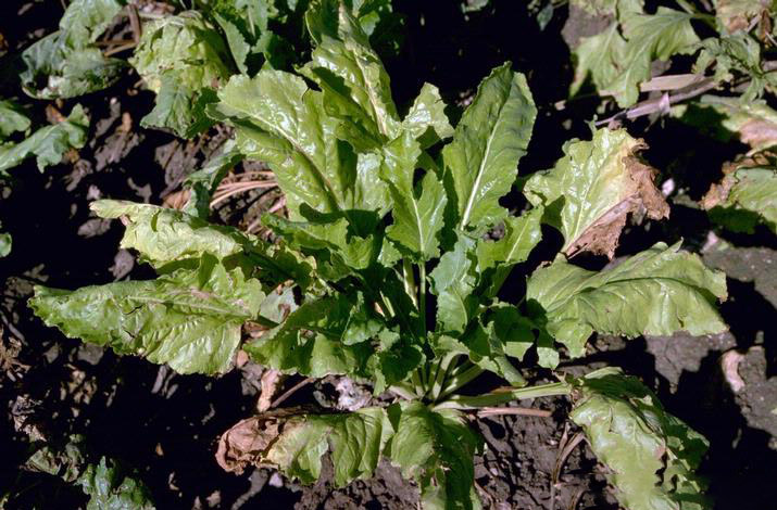 Nitrogen deficiency in sugar beet causes reduced root and sugar yield. Nitrogen-deficient sugar beet plants are significantly smaller and their growth is stunted. The leaves of affected plants are initially light green, then turn uniformly yellow as the deficiency progresses. The yellowing is uniform across the entire leaf, distinguishing it from some other deficiencies that cause patchy or interveinal symptoms.
