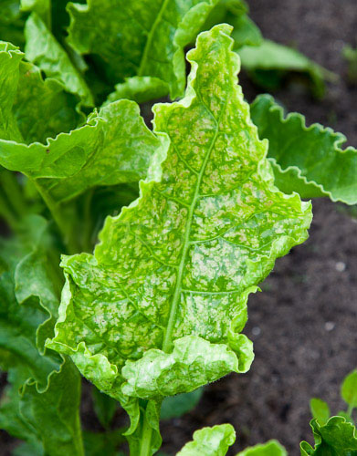 Sugar beet is sensitive to manganese (Mn) deficiency, which can appear at the 2-leaf stage. The most obvious symptom is yellow spotting between the veins on older leaves, while the veins and the small border around them remain green, giving the leaf a “spotted” appearance.